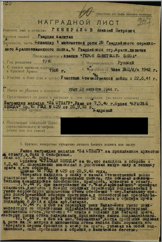 Погиб в бою 13 октября 1944 года. Осенью 2009 года поисковым отрядом в районе поселка Корзуново были обнаружены останки советского воина. По номерам медали «За отвагу» и ордена Красной Звезды, найденных при нем, было установлено имя – Генералов Алексей Петрович. Останки героя были перевезены на родину и 15 октября 2009 года торжественно захоронены на аллее Славы, Троицко-Никольского кладбища города Коврова.