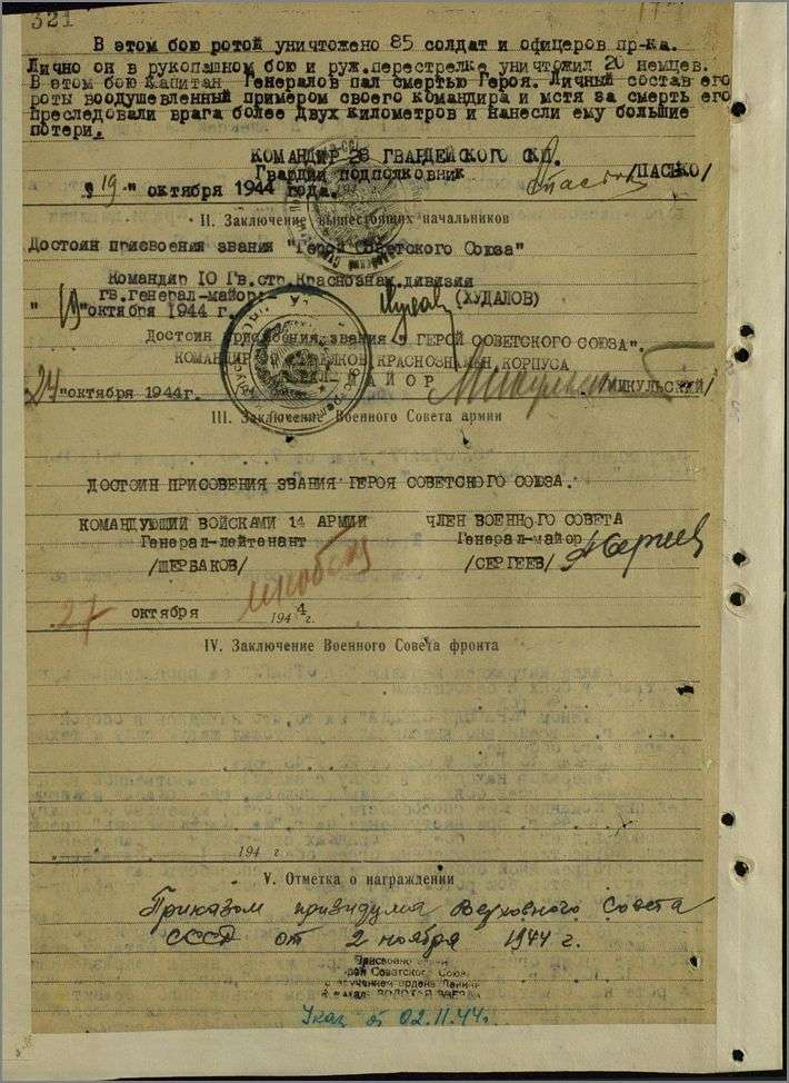 Указ Президиума Верховного Совета СССР от 02.11.1944, посмертно.