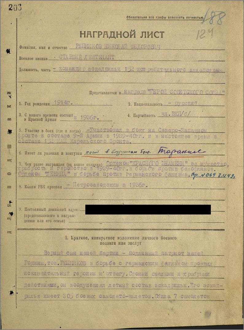 Указ Президиума Верховного Совета СССР от 22.02.1943, посмертно.