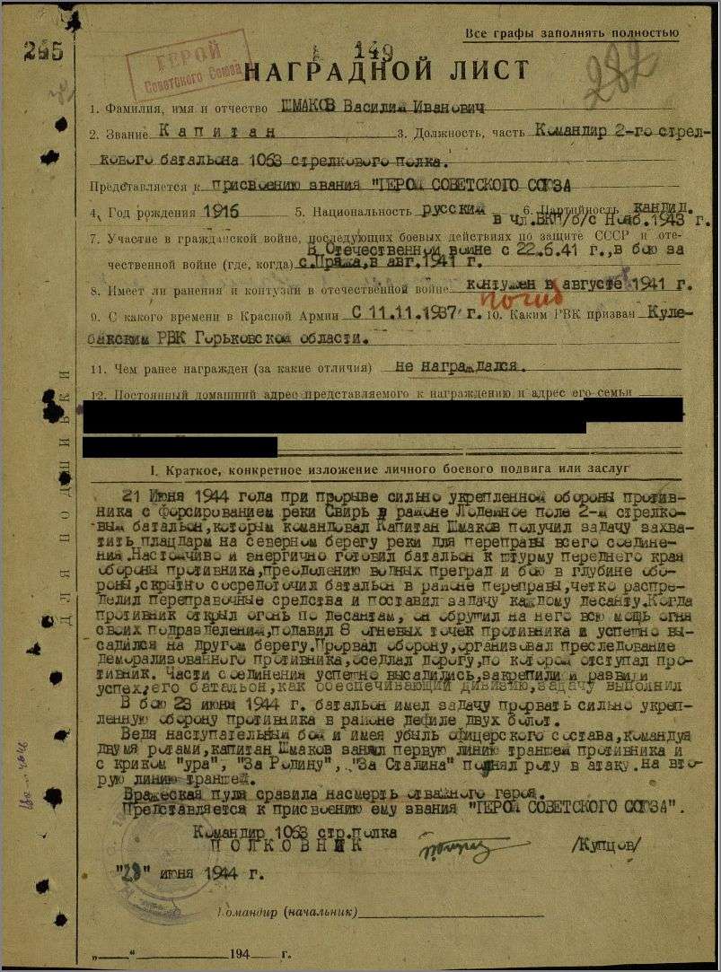 Указ Президиума Верховного Совета СССР от 21.07.1944, посмертно.